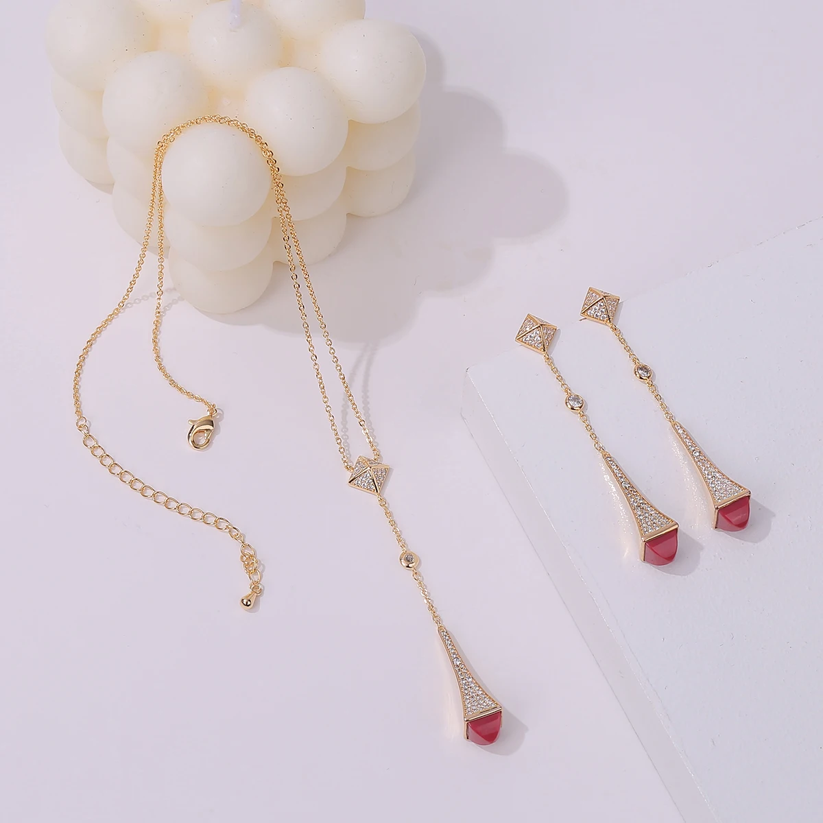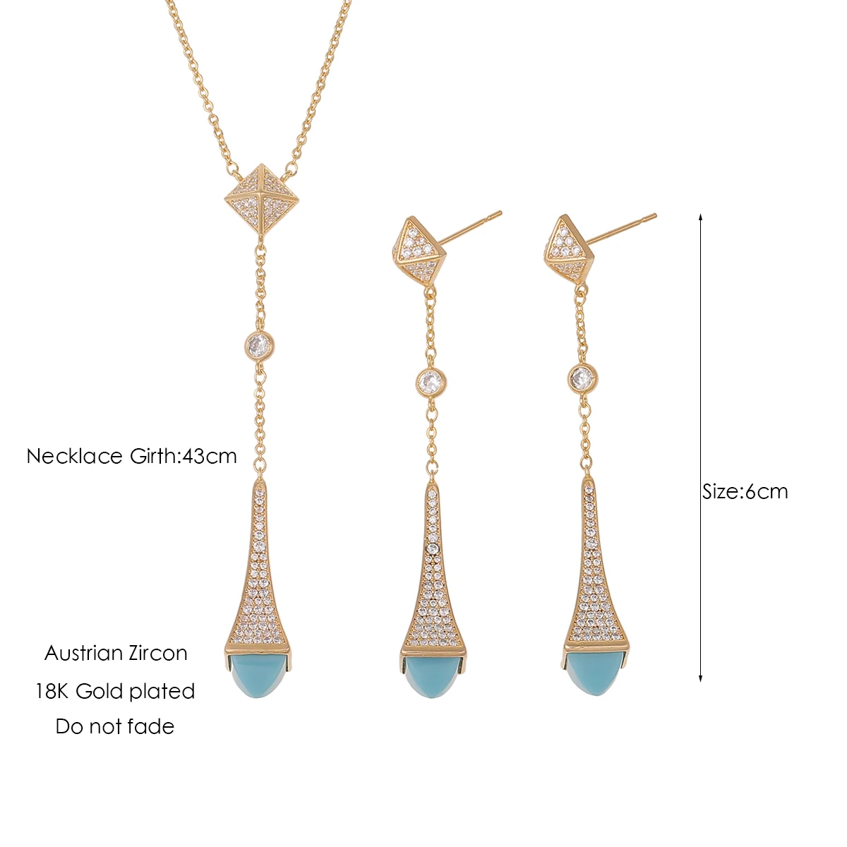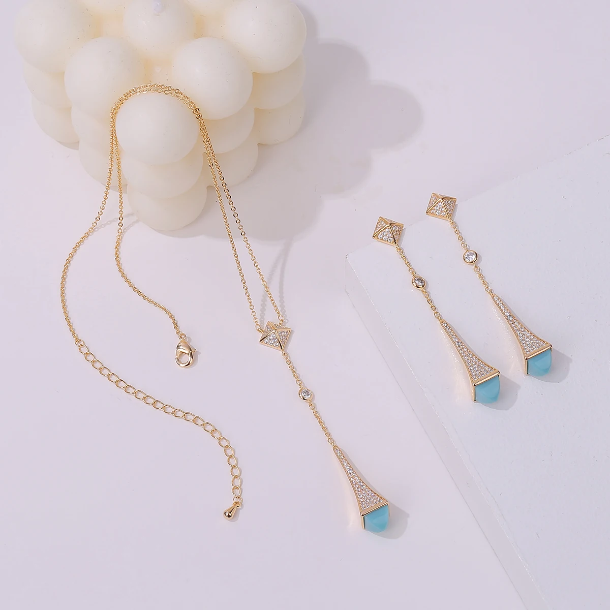 2021 Romatic Women's Fashion 2 Pcs Necklace & Earrings Set Caolorful stone Simple Design Gold Necklace Drop Earring Jewelry Set